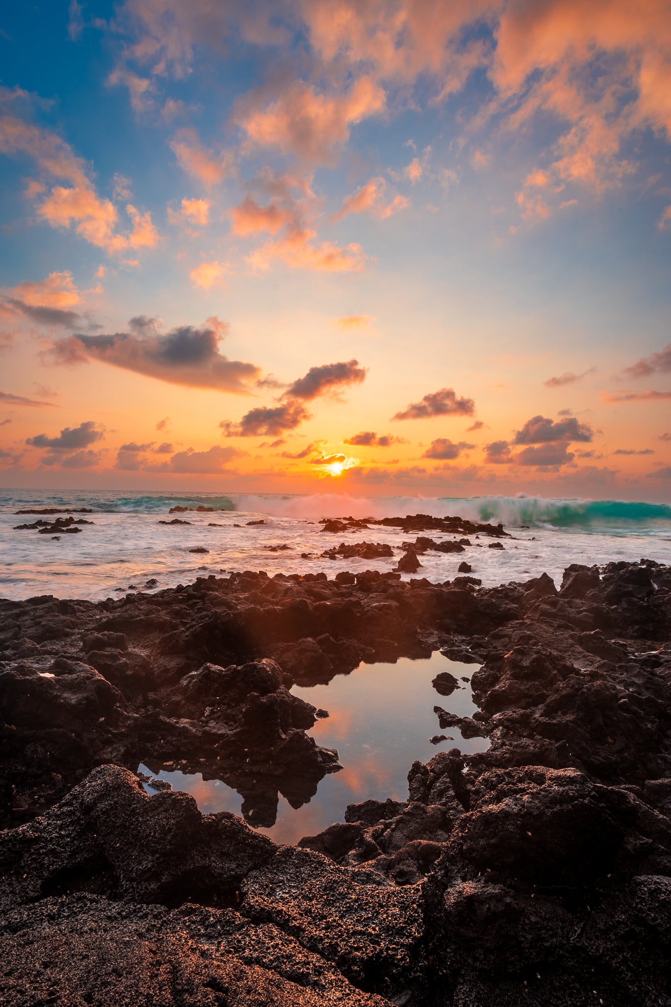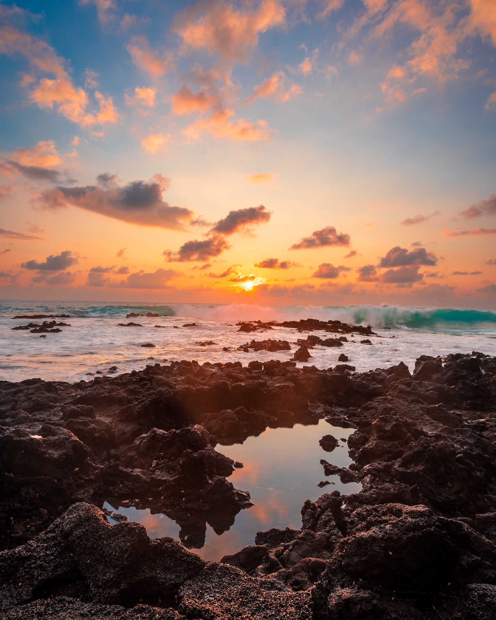 When you visit a place like Big Island, Hawaii there are plenty of well-known locations to catch a sunset.  This is not one of them.  Instead, a scramble along the rocky shoreline led to this isolated scene.  A beautiful tide pool reflected the suns last rays, as massive turquoise waves crested the horizon.