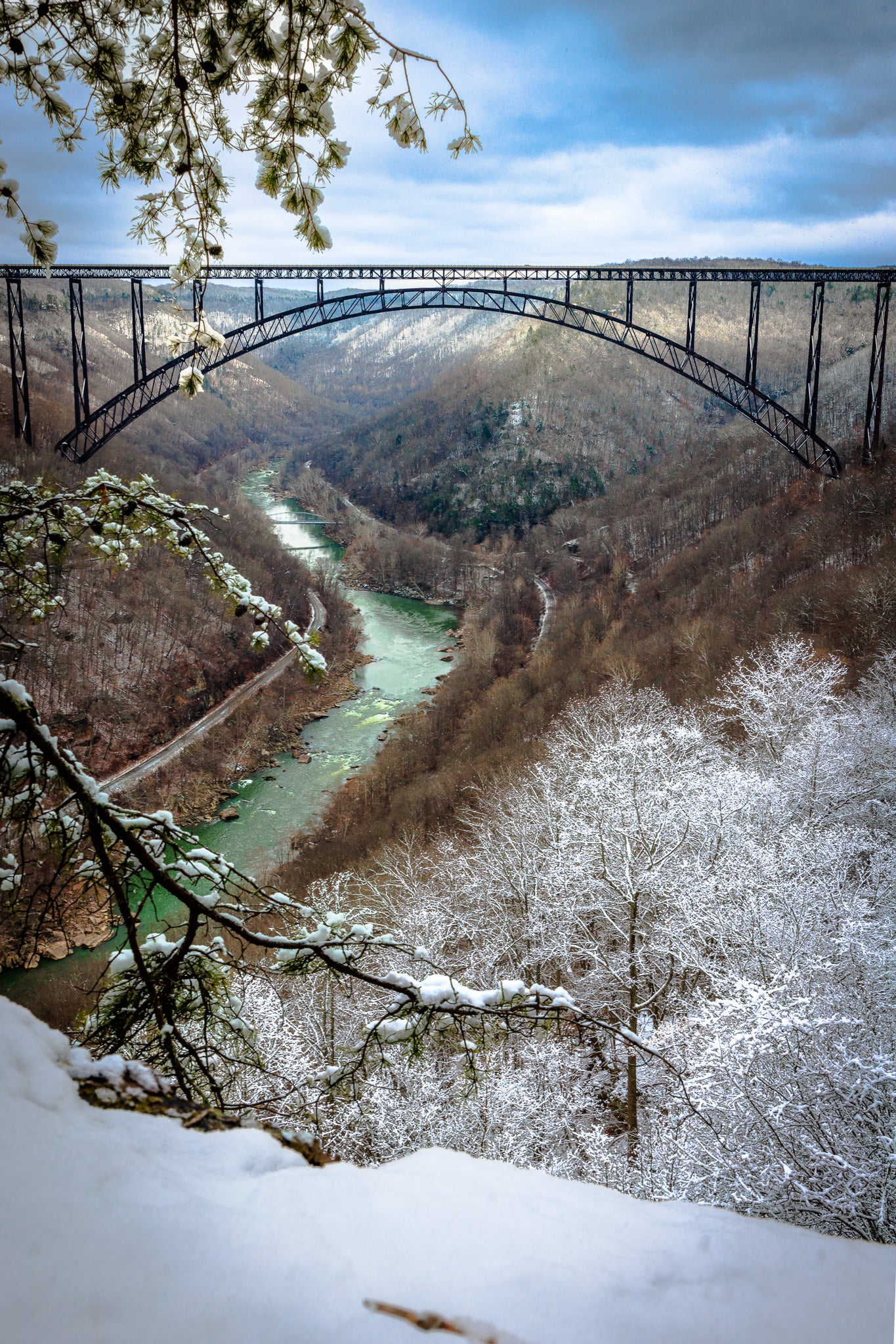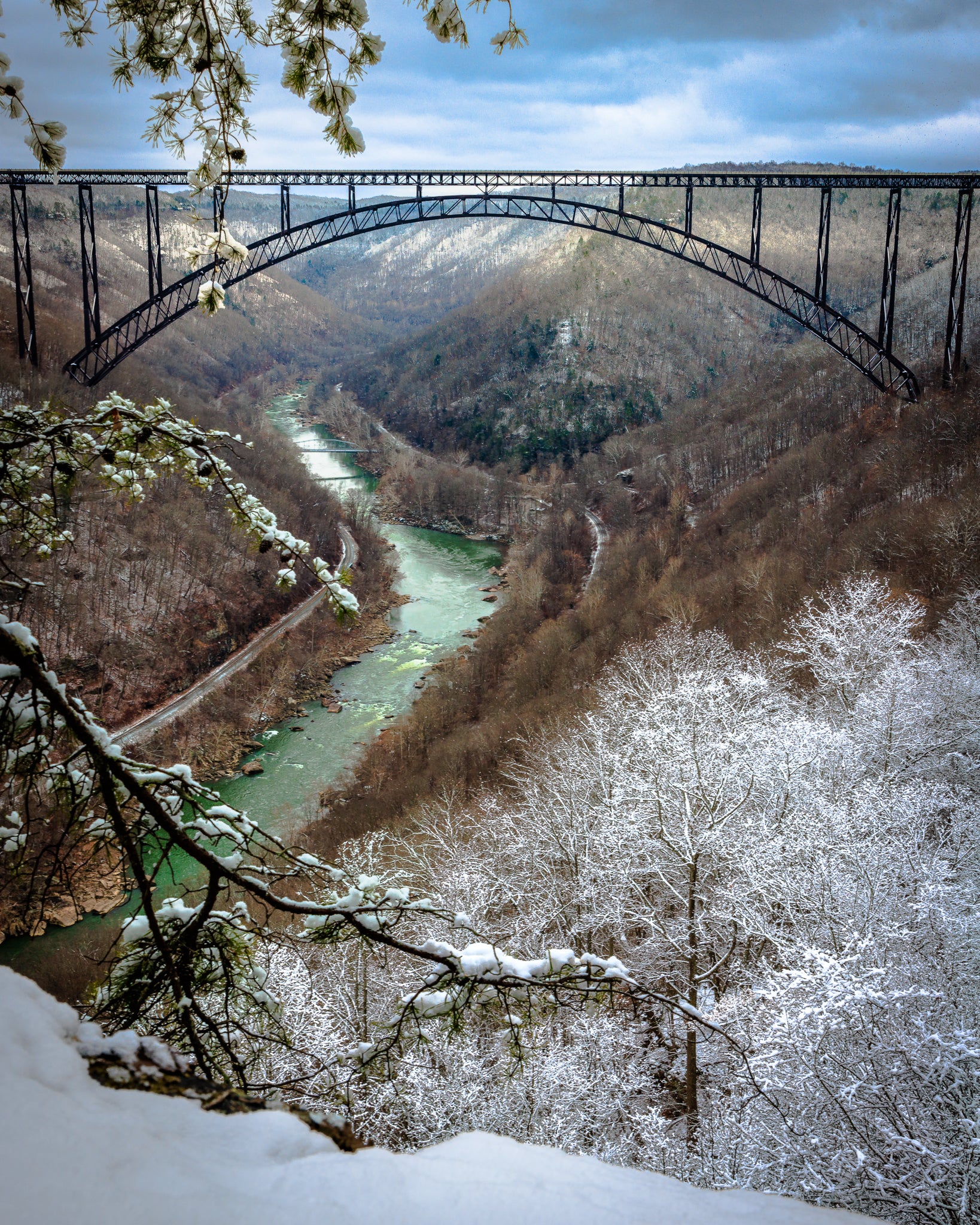 Lots to love ‘bout this shot. The emerald New River standing out against a stark wintry gorge. The bent pine bow mirroring the bridge’s arch. Minutes earlier, Dave Green & I polar-plunged into that very river - 42 degrees on a 26 degree day. Then, we hiked to this vantage, Bridge Buttress - one of the tougher scrambles around. That’s what I call a solid New Year’s Day!