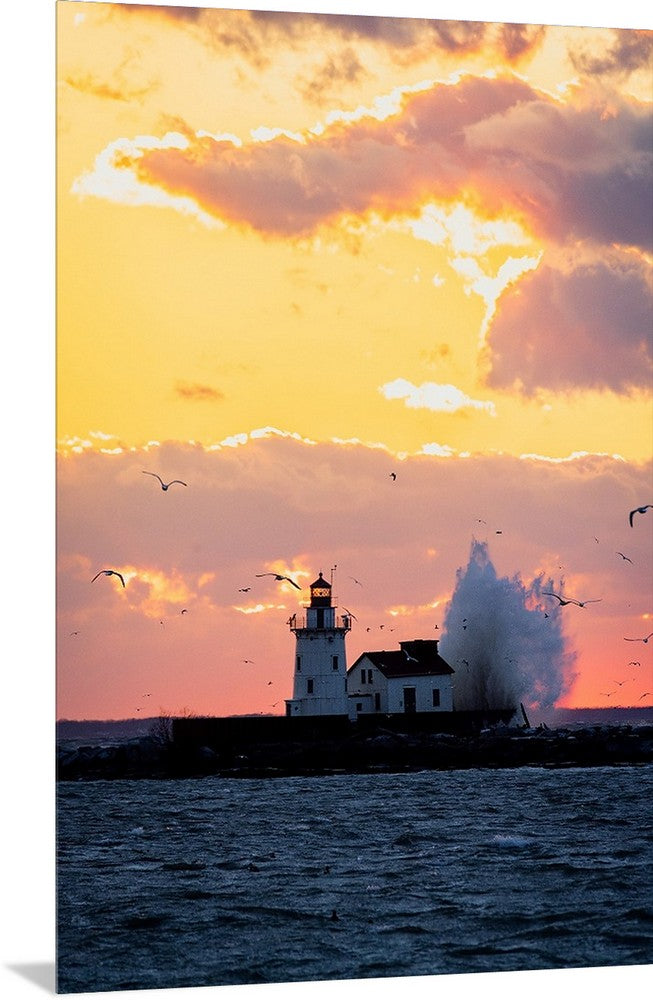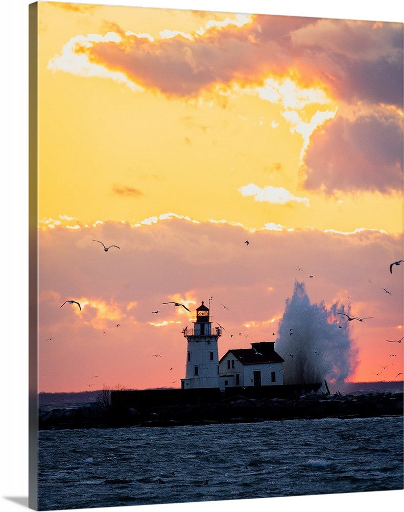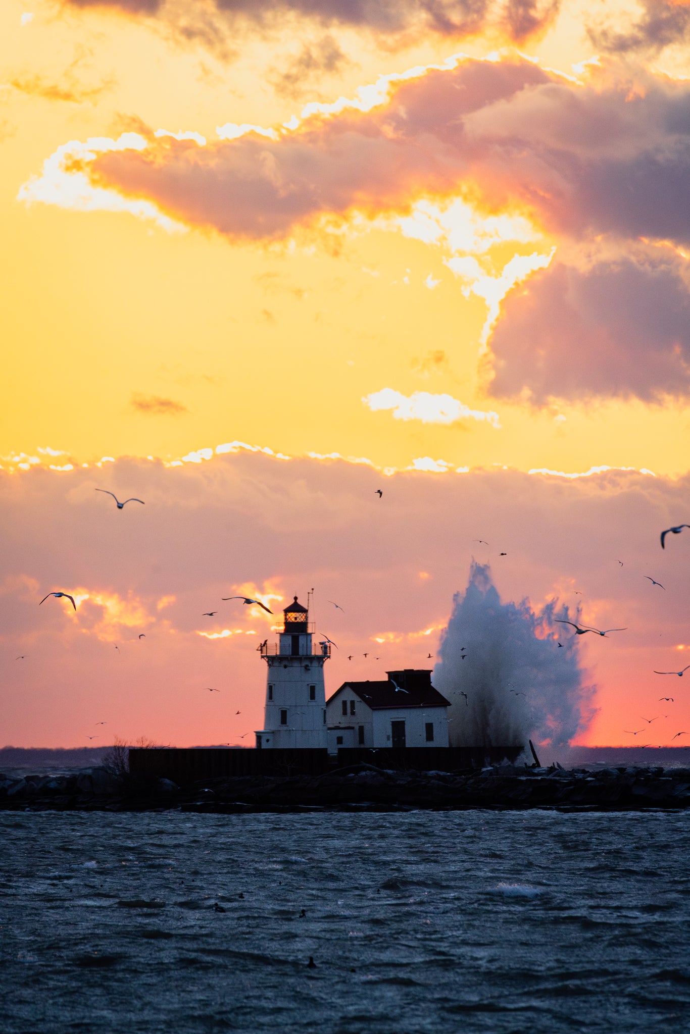A 75-ft wave cascades over Cleveland’s West Pierhead Lighthouse, standing 67-ft above water level). A a record wind gust of 85-MPH was recorded yesterday at nearby Burke Lakefront Airport. All of those big numbers resulted into a glorious scene at sunset.